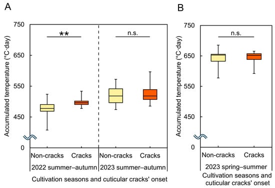 Comparison of accumulated temperature between fruits with cuticular cracks and without cuticular cracks from anthesis to the onset of cuticular cracks. The accumulated temperature was calculated as the sum of the daily mean temperatures over 20 (2022 and 2023 summer–autumn cultivations) or 30 (2023 spring–summer cultivation) days following anthesis. ** indicates a significant difference (p < 0.01), and n.s. indicates no significant difference between fruits with cuticular cracks and without cuticular cracks by t-test. (A): 2022 and 2023 summer–autumn cultivations. n = 32–53. (B): 2023 spring–autumn cultivation. n = 27 (fruits with cuticular cracks) and 52 (fruits without cuticular cracks).