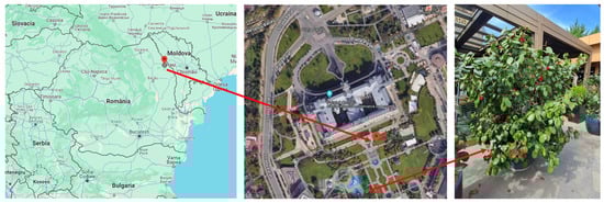 Pestalotiopsis sp. on camellia plants grown in pots as landscaping of a public garden located in Iasi city, Romania (GPS coordinate: www.google.com/maps, accessed on 4 July 2024, 47°09′24.0″ N 27°35′15.6″ E). Red arrows represent the exact location of the plant material investigated. Red x marks the physical location of the ornamental plant pots.