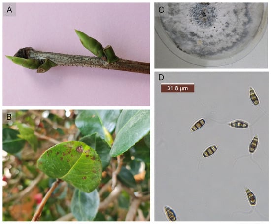 Pestalotiopsis sp. causing twigs gray blight on Camellia japonica L. (A) Infected camellia twigs; (B) Infected camellia leaf spot; (C) Colony surface on PDA medium; (D) Conidia.