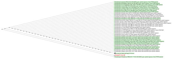 Genetic distance tree of isolate P_CJ_24 (marked in red) and the NCBI-BLAST results, using “neighbor joining” method, max seq difference = 0.5. Sample sequence has a length of 564 bp and was amplified using PCR specific nuclear ribosomal internal transcribed spacer (ITS) primers.