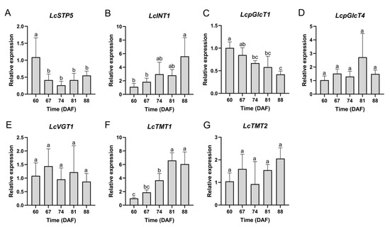 LcMST genes exhibit distinct tissue-specific expression patterns. During fruit development in the hexose-dominant cultivar ‘Tianshuili’, the expression of the tonoplast monosaccharide transporter gene