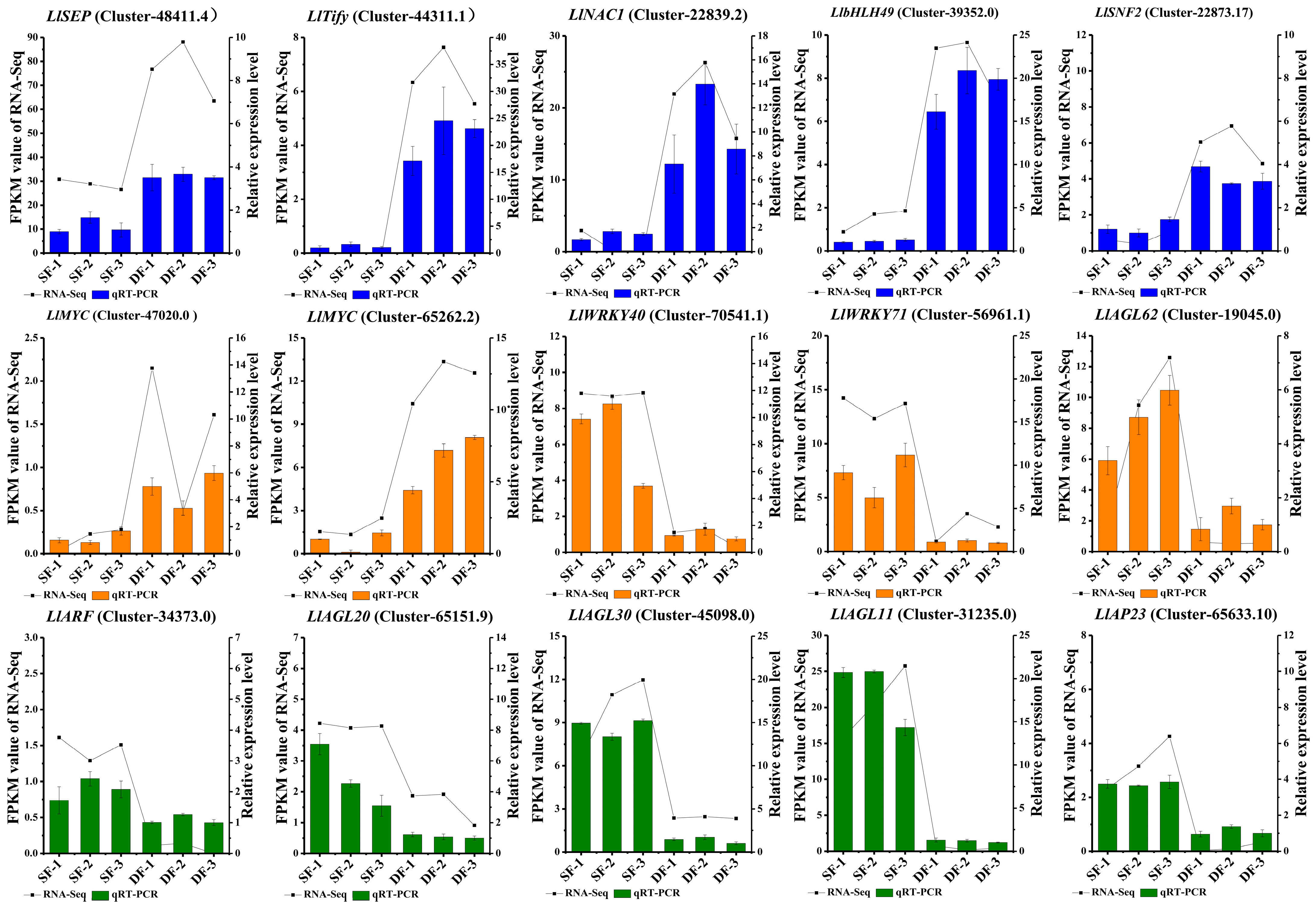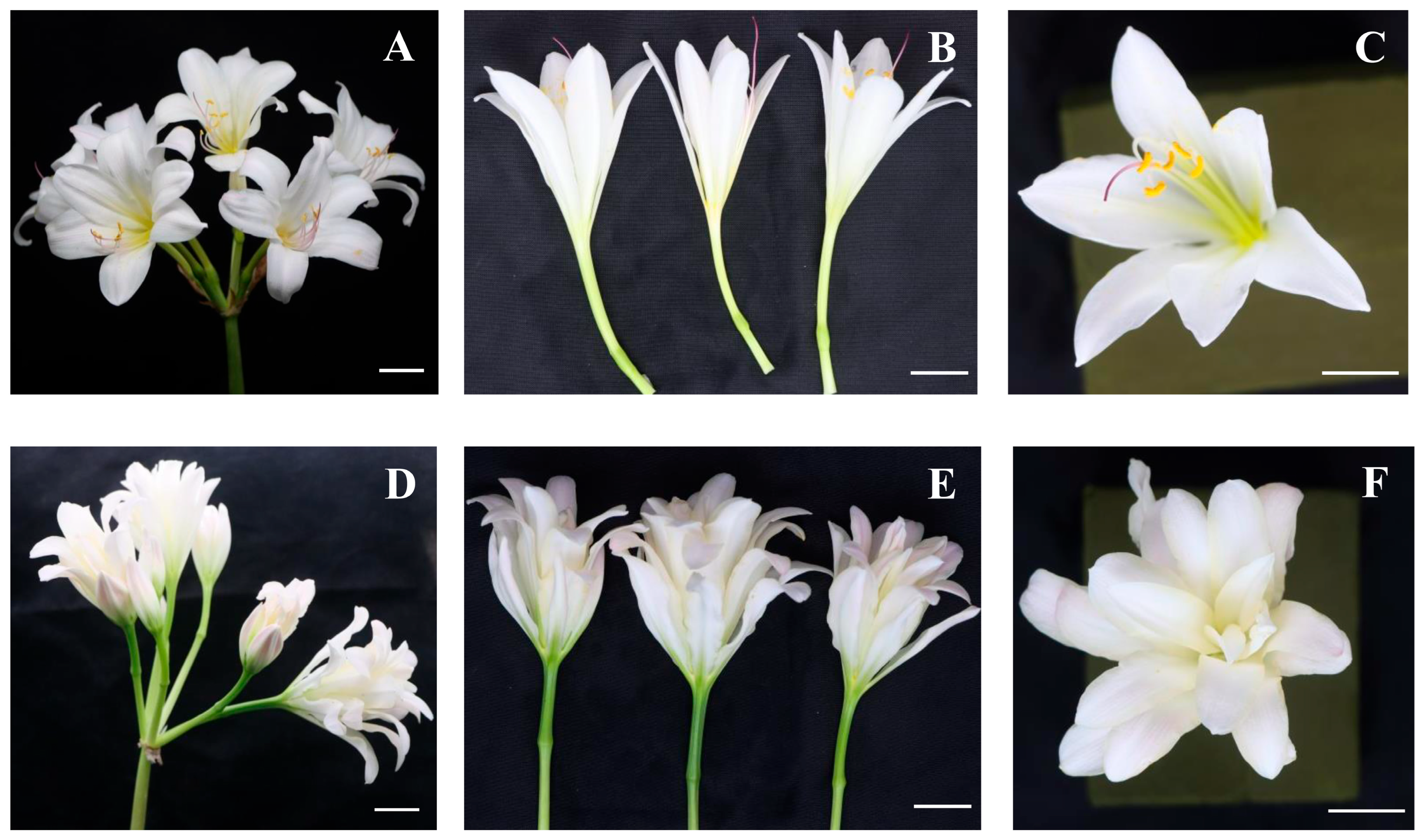 - Li, H.; Song, S.; Wang, C.; Sun, H. Comparative transcriptome analysis reveals the molecular mechanism underlying lily double flowering. Sci. Hortic. 2022, 303, 111221. [Google Scholar] [CrossRef]