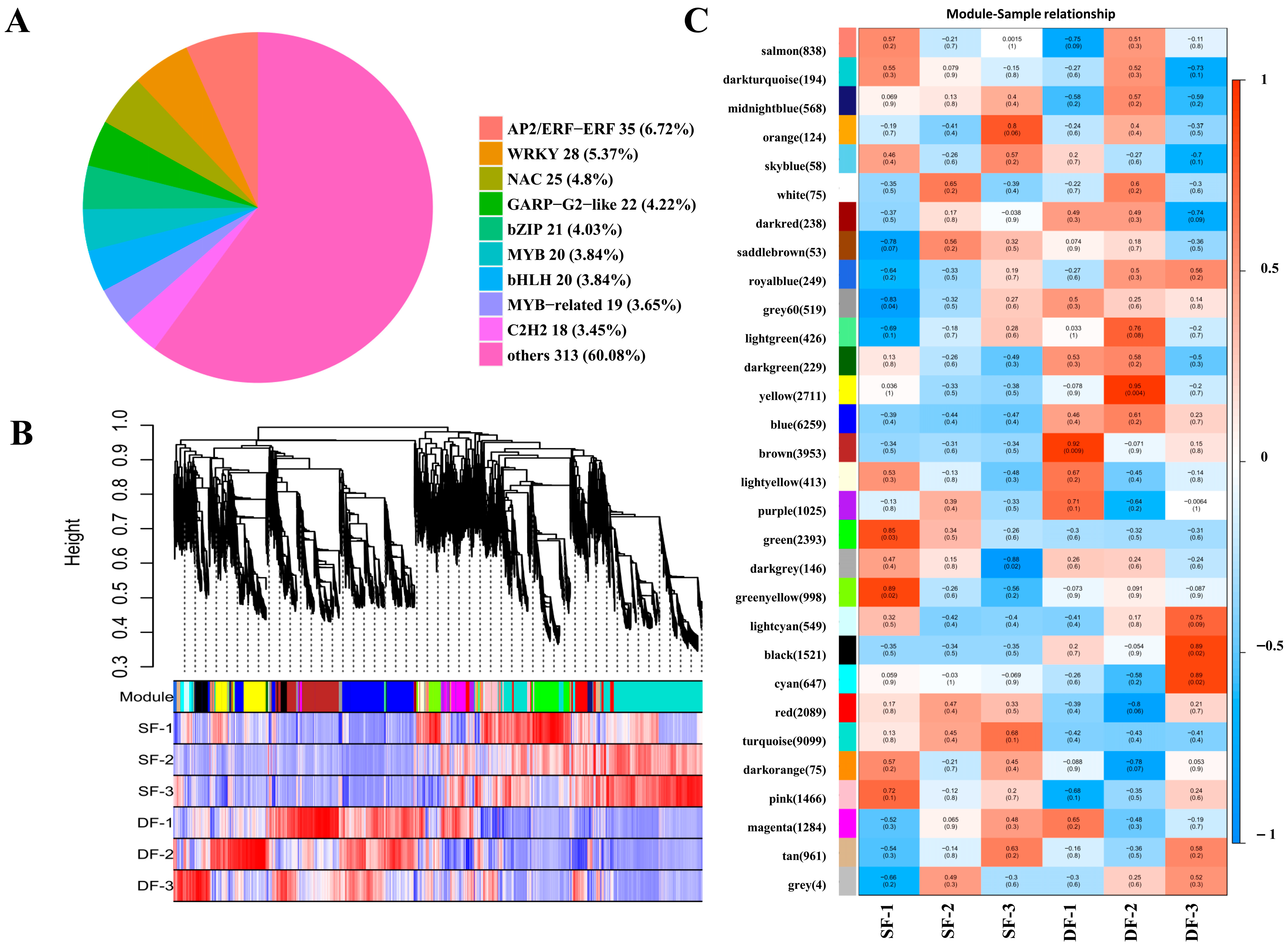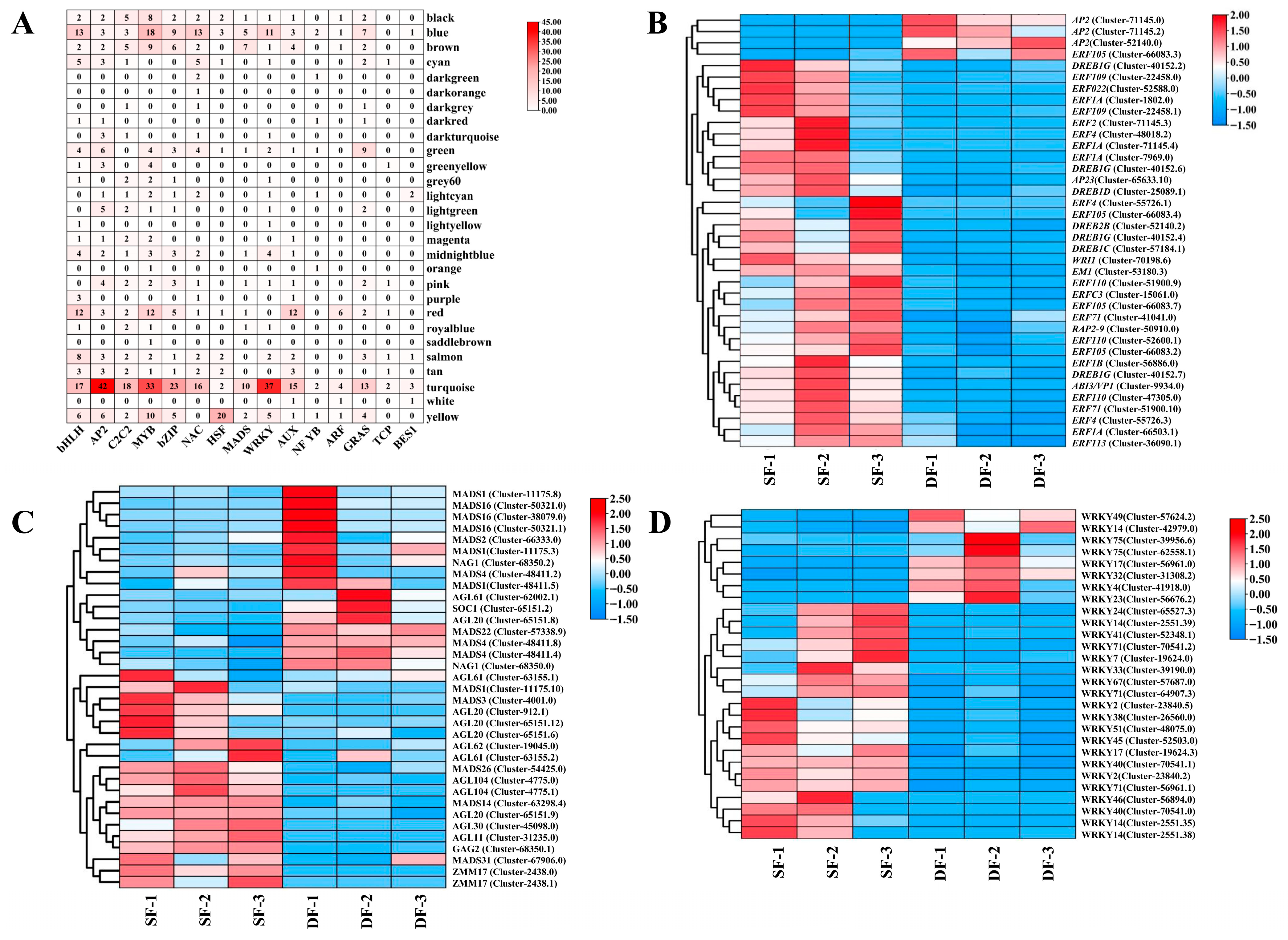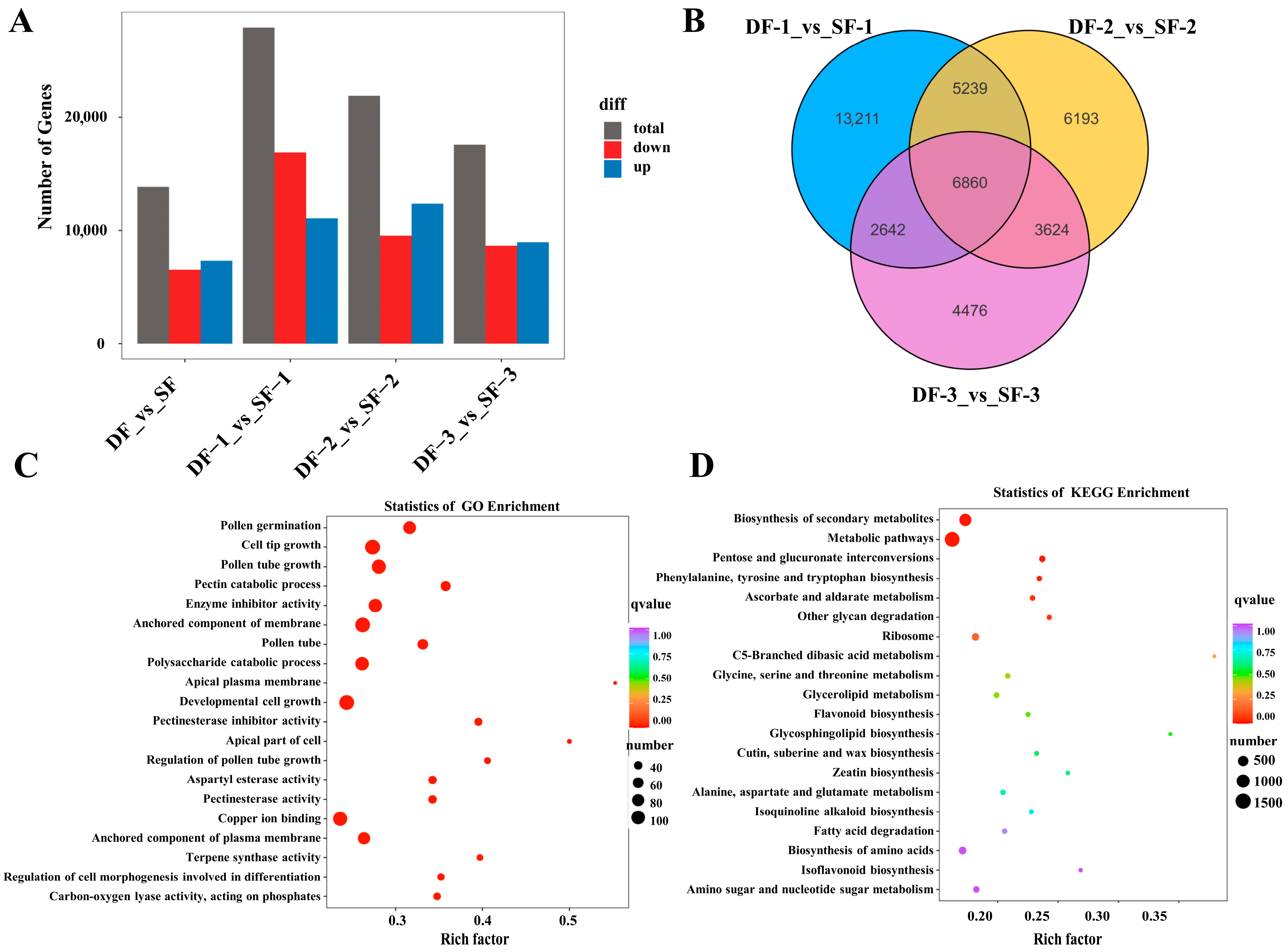 - Luo, Y.; Li, Y.; Yin, X.; Deng, W.; Liao, J.; Pan, Y.; Jiang, B.; Yang, H.; Ding, K.; Jia, Y. Transcriptomics analyses reveal the key genes involved in stamen petaloid formation in Alcea rosea L. BMC Plant Biol. 2024, 24, 551. [Google Scholar] [CrossRef]