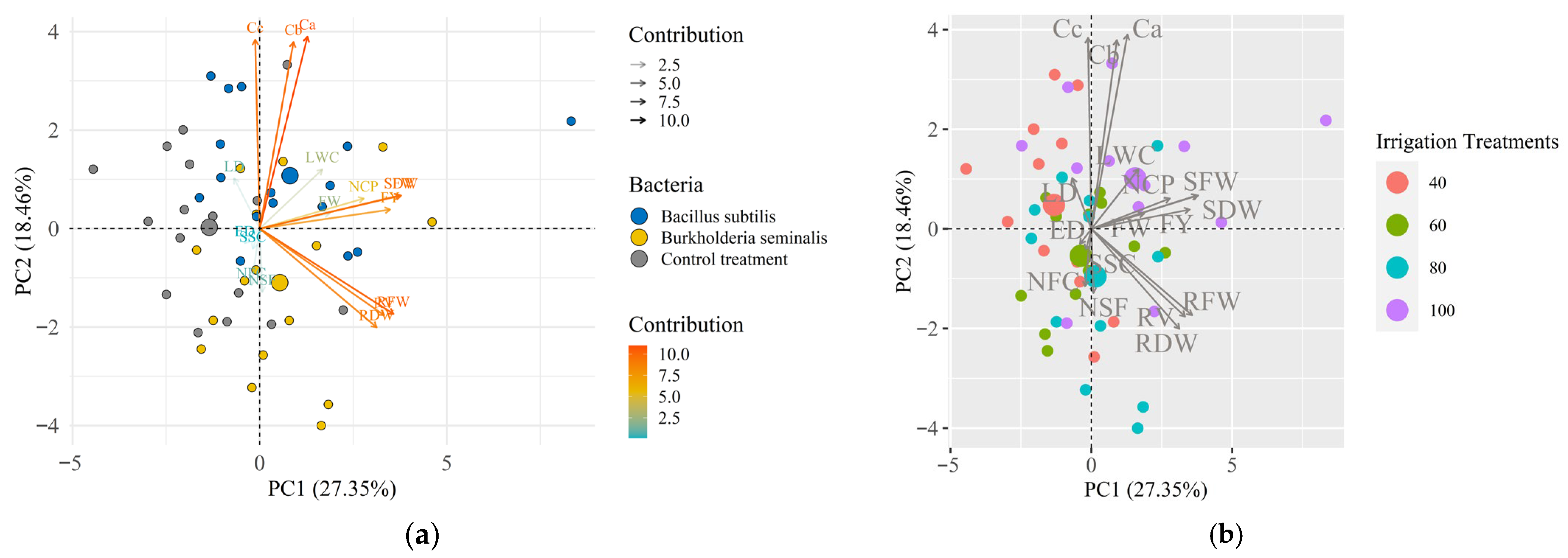 - Lucas, J.A.; Garcia-villaraco, A.; Montero-palmero, M.B.; Solano, B.R.; Gutierrez-mañero, F.J.; Montalban, B. Physiological and genetic modifications induced by plant-growth-promoting rhizobacteria (PGPR) in tomato plants under moderate water stress. Biology 2023, 12, 901. [Google Scholar] [CrossRef]