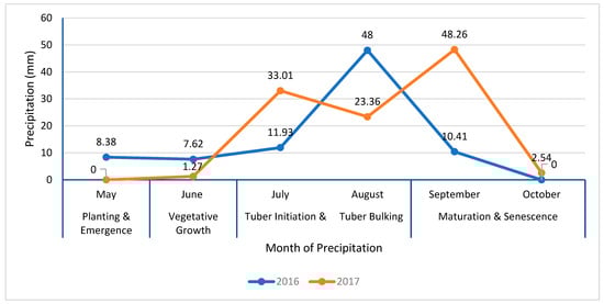 Monthly precipitation at the San Luis Valley Research Center in Colorado from potato planting until harvest in 2016 and 2017, modified from [7].