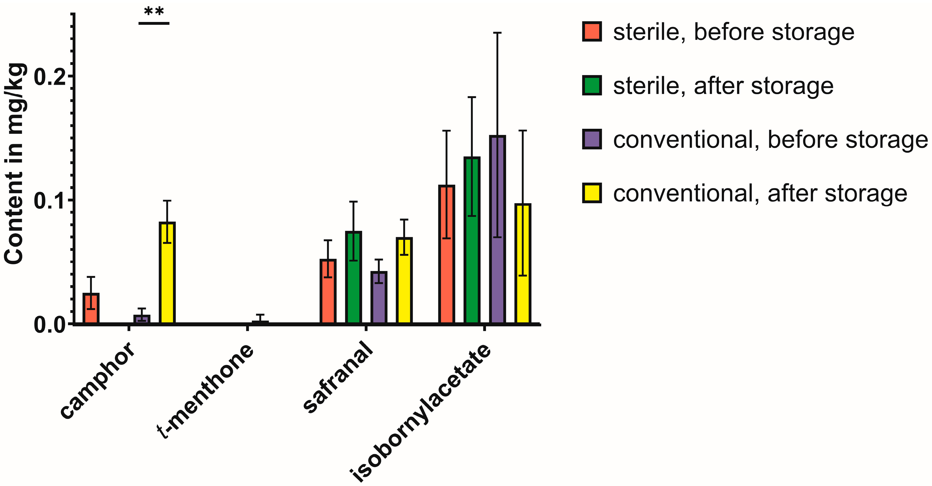 Camphor | 0.03 | 0.02 | 0.00 | 0.00 | 0.01 | 0.01 | 0.08 | 0.02 | ** | |