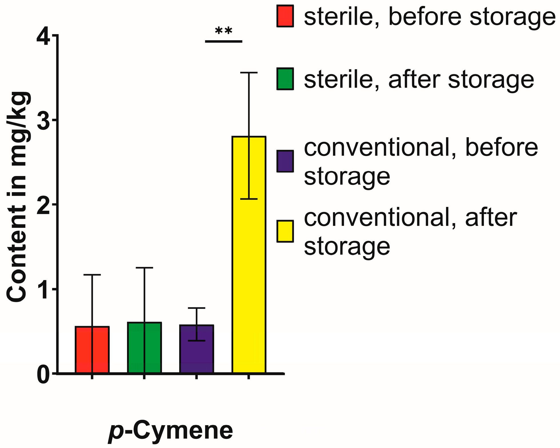p-Cymene | 0.57 | 0.60 | 0.61 | 0.64 | 0.58 | 0.19 | 2.82 | 0.78 | ** | |
