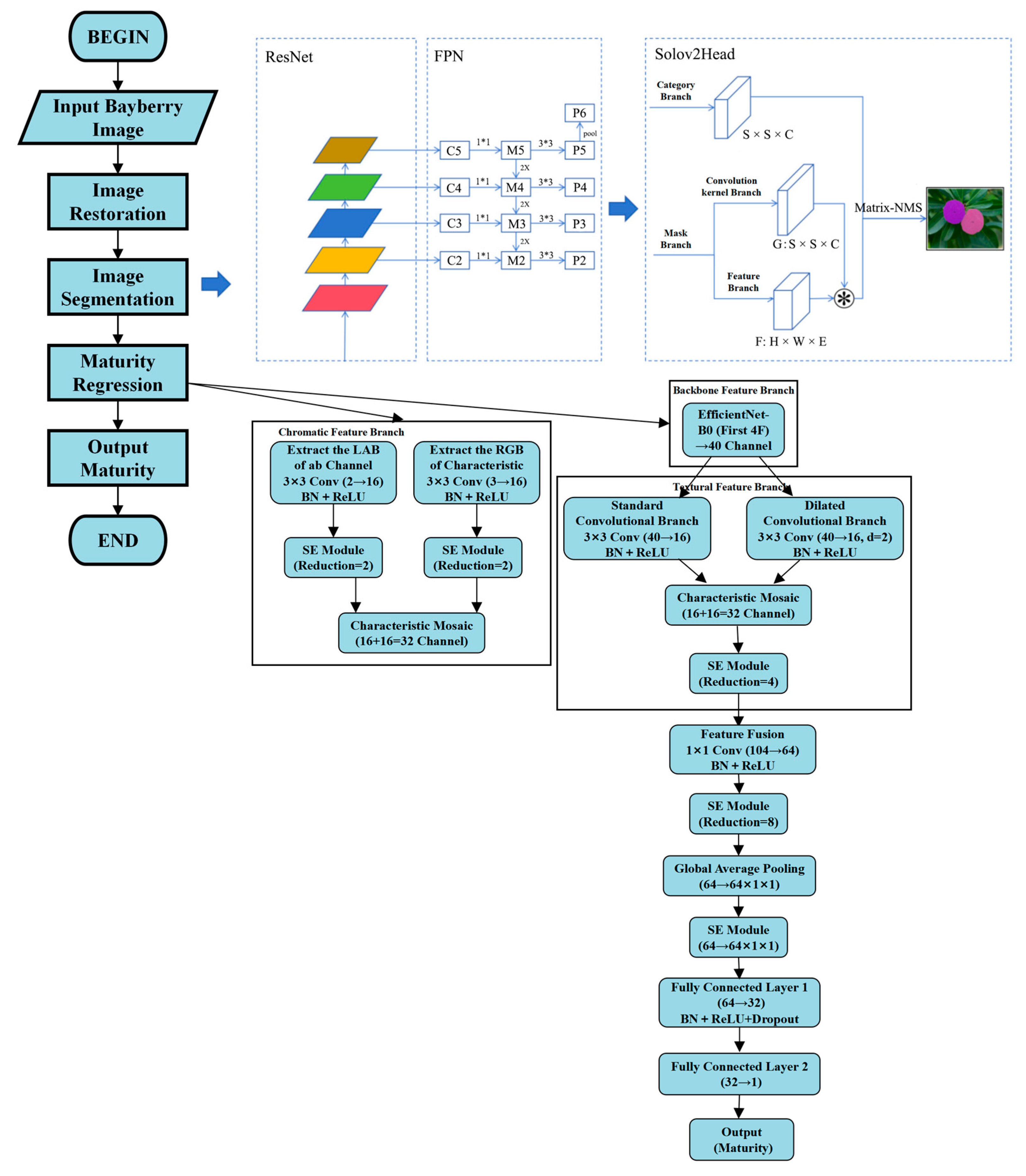 APA StyleZheng, H., Sun, L., Wang, Y., Yang, H., & Zhang, S. (2025). Image-Based Detection of Chinese Bayberry (Myrica rubra) Maturity Using Cascaded Instance Segmentation and Multi-Feature Regression. Horticulturae, 11(10), 1166. https://doi.org/10.3390/horticulturae11101166