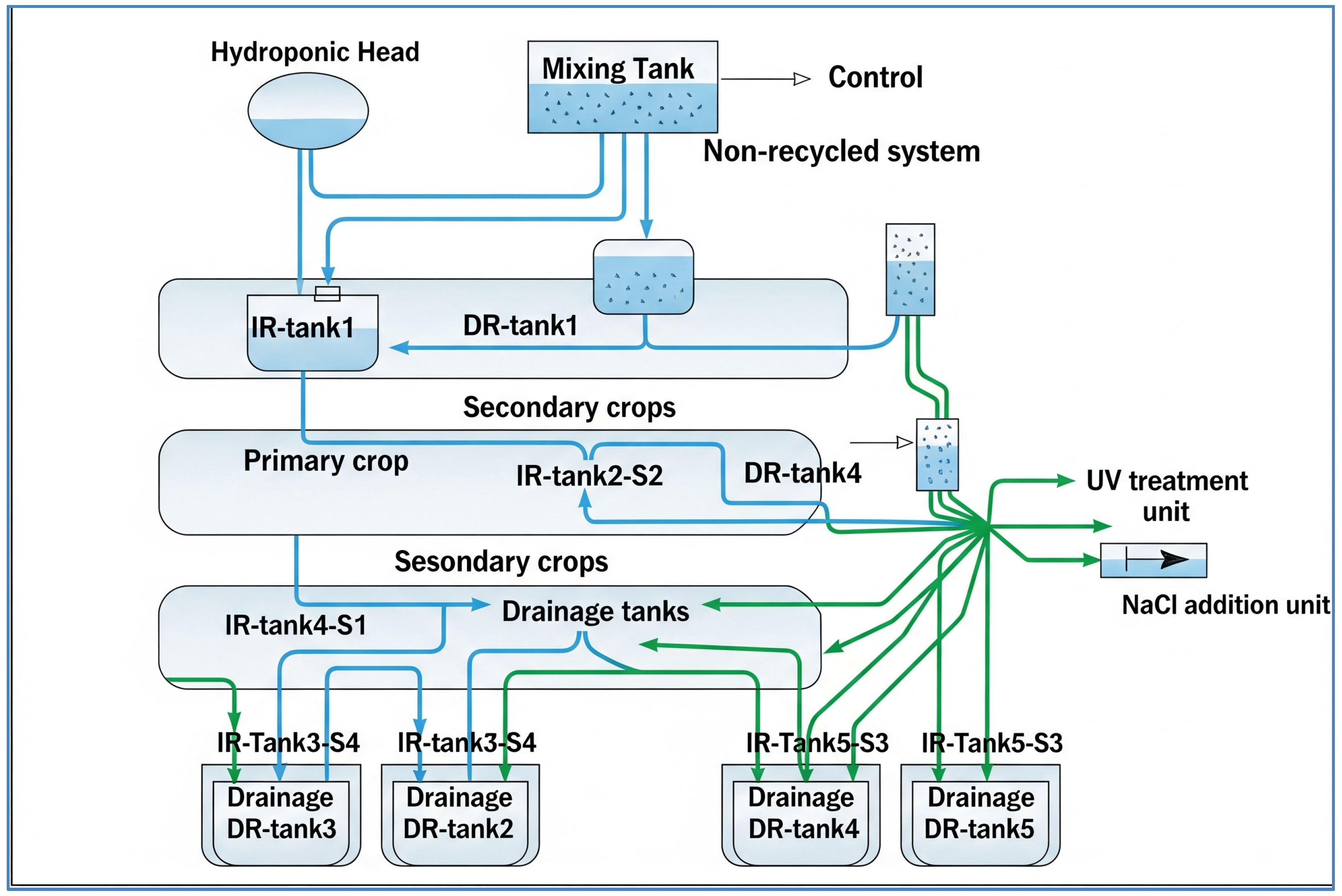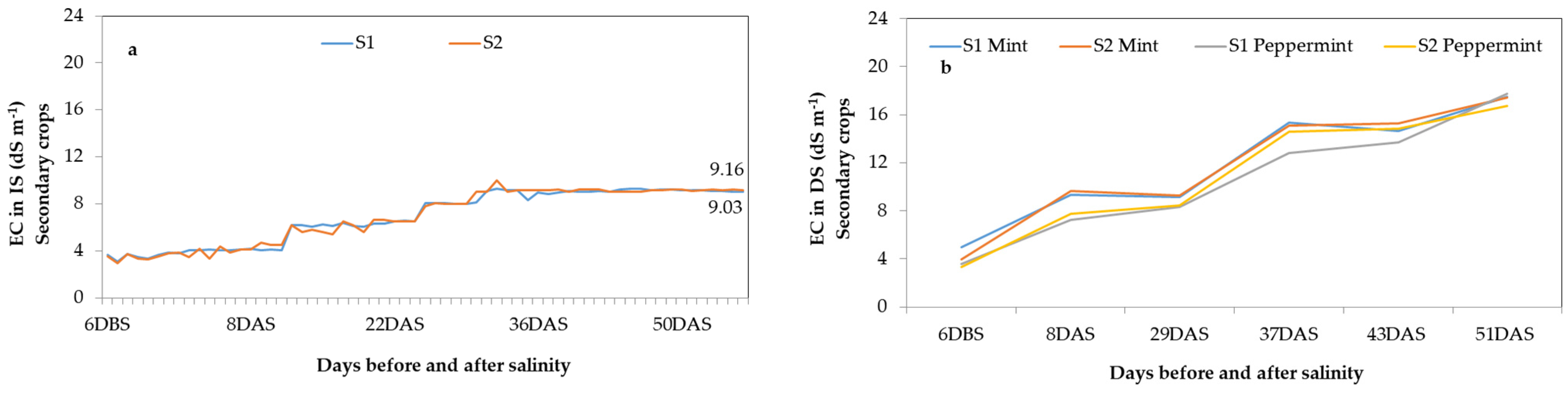 - S2: Irrigation with 100% drainage solution (DS) from the primary crop, supplemented with NaCl to reach the same target EC of 9 dS m−1.