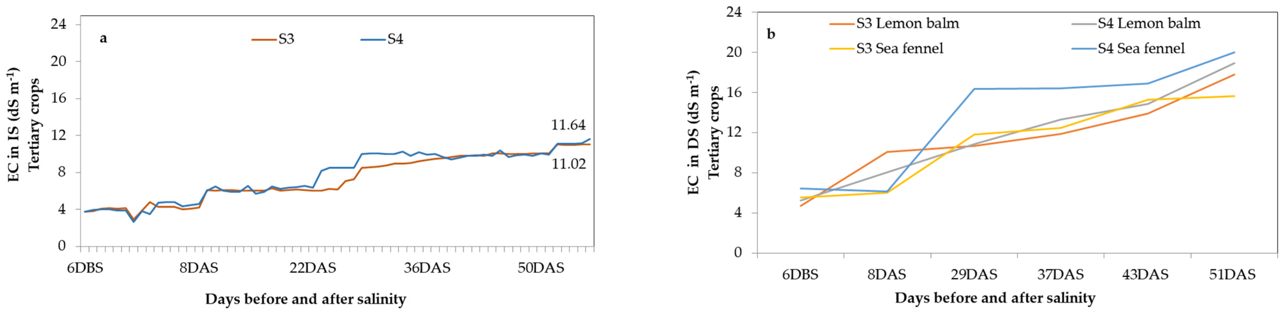 - S4: Irrigation with NS mixed from S2 and S4 treatment DS, with additional NaCl to reach the target EC of 11 dS m−1.