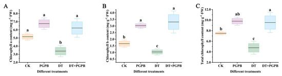 Effects of UW4 on the contents of chlorophyll a (A), chlorophyll b (B), and total chlorophyll (C) in garlic seedlings under drought stress. Note—CK: Control group of garlic plants under normal irrigation; PGPB: Treatment group of garlic plants inoculated solely with Pseudomonas sp. UW4; DT: Experimental group of garlic plants subjected to drought stress treatment; DT + PGPB: Experimental group of garlic plants exposed to drought stress and simultaneously inoculated with Pseudomonas sp. UW4. Means with different lowercase letters are significantly different according to Tukey’s HSD test (p ≤ 0.05). Values sharing a common letter are not significantly different. (Same below).