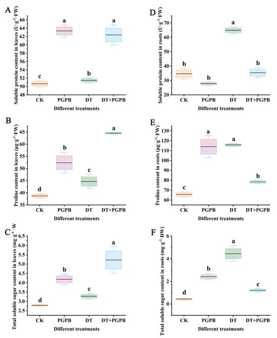Effects of PGPB on contents of soluble protein (A,D), proline (B,E), and soluble sugar (C,F) in garlic seedlings under drought stress.