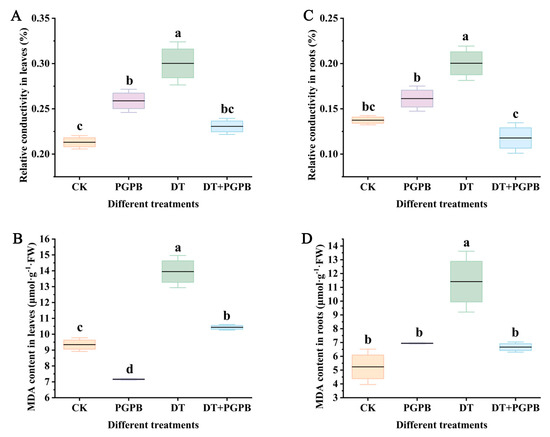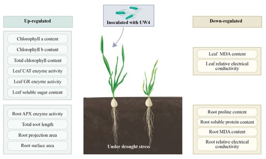 Moreover, the change of malondialdehyde (MDA) content was similar to that of relative electrical conductivity. MDA content was significantly higher in both leaves and roots in garlic under drought stress compared with the garlic under normal conditions, which had an increase of 49.26% and 117.99%, respectively (Figure 3). In contrast, in the garlic plants inoculated with strain UW4, it decreased by 25.19% and 41.58% in leaves and roots, demonstrating the significant effect of strain UW4 in alleviating membrane damage caused by drought stress.