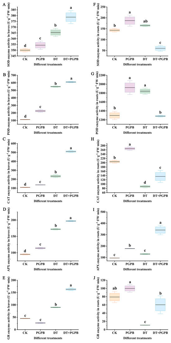 Effects of strain UW4 on activities of SOD (superoxide dismutase) (A,F), POD (peroxidase) (B,G), CAT (catalase) (C,H), APX (ascorbate peroxidase) (D,I), and GR (glutathione reductase) (E,J) in leaf and root of garlic seedlings under drought stress.