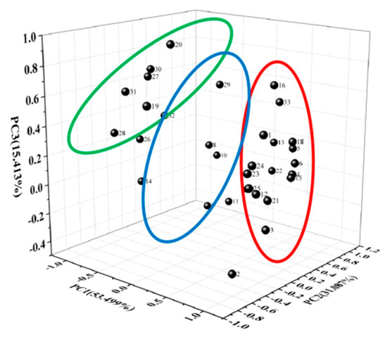 Effects of PGPB treatment on the characteristic vectors of growth and physiological indices in roots and leaves of garlic under drought stress. Note: The red circle represents principal component 1 main factor, the basket circle represents principal component 2 main factor, and the green circle represents principal component 3 main factor.