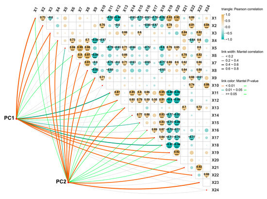 Mantel tests between the indicators selected by the first principal component (PC1), the second principal component (PC2), and the remaining variables. Note: PC1 comprised chlorophyll a content, chlorophyll b content, total chlorophyll content, root length, root surface area, root projection area, and root volume. PC2 comprised leaf soluble total sugar content and root APX enzyme activity. X1: Root Soluble Protein Content; X2: Root soluble sugar content; X3: Leaf soluble protein content; X4: Leaf SOD enzyme activity; X5: Leaf POD enzyme activity; X6: Leaf CAT enzyme activity; X7: Leaf APX enzyme activity; X8: Leaf GR enzyme activity; X9: Root SOD enzyme activity; X10: Root POD enzyme activity; X11: Root CAT enzyme activity; X12: Root GR enzyme activity; X13: Root diameter; X14: Number of root tip; X15: Plant height; X16: leaf width; X17: Aboveground dry weight; X18: Root dry weight; X19: MDA content in roots; X20: MDA content in leaves; X21: Leaf Relative Conductivity; X22: Root relative conductivity; X23: Leaf proline content; X24: Root proline content. Statistical significance is indicated as follows: * p < 0.05, ** p < 0.01, *** p < 0.001.