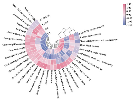 1. Plant height; 2. Leaf width; 3. Dry weight of ground part; 4. Chlorophyll a content; 5. Chlorophyll b content; 6. Total chlorophyll content; 7. SOD enzyme activity in leaves; 8. POD enzyme activity in leaves; 9. CAT enzyme activity in leaves; 10. APX enzyme activity in leaves; 11. GR enzyme activity in leaves; 12. Soluble protein content in leaves; 13. Total soluble sugar content in leaves; 14. MDA content in leaves; 15. Root length; 16, Root volume; 17. Root surface area; 18. Root projection area; 19. SOD enzyme activity in roots; 20. POD enzyme activity in roots; 21. GR enzyme activity in roots; 22. APX enzyme activity in roots; 23. CAT enzyme activity in roots; 24. The number of roots; 25. Root dry weight; 26. Soluble protein content in roots; 27. Soluble sugar content in roots; 28. MDA content in roots; 29. Average diameter in roots; 30. Blade relative conductivity; 31. Relative electrical conductivity of root system; 32. Proline content in leaves; 33. Proline content in roots.