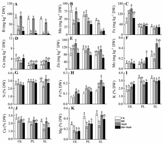 Effect of boron and manganese co-deficiency on mineral nutrient concentrations in the leaves of ‘Newhall’ navel orange [Citrus sinensis (L.) Osb. CV. Newhall] seedlings. (A) boron concentration; (B) manganese concentration; (C) iron concentration; (D) copper concentration; (E) zinc concentration; (F) molybdenum concentration; (G) nitrogen concentration; (H) phosphorus concentration; (I) potassium concentration; (J) calcium concentration; (K) magnesium concentration. Two-year-old ‘Newhall’ navel orange seedlings were grown under boron, manganese, or boron and manganese co-deficiency conditions for 31 weeks. CK: Control; BD: Boron deficiency; MnD: Manganese deficiency; BD + MnD: Boron + manganese co-deficiency. Data are presented as the mean ± standard error of four biological replicates. DW, dry weight. Different lowercase letters above the bars indicate significant differences (p < 0.05) between the different treatments. OL, old leaf; PL, primary new leaf; SL, secondary new leaf.