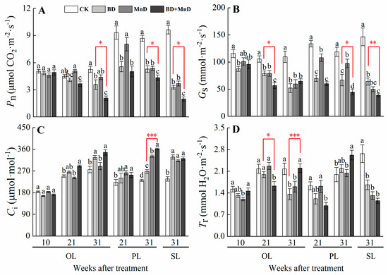 As shown in Figure 3, the Pn value of the OLs of ‘Newhall’ navel orange in the BD and BD + MnD treatment groups declined as the treatment duration increased compared with the CK group, and this increase became significant in the 21st and 31st weeks of treatment. In contrast, the MnD treatment had no significant effect on the Pn value of OLs. The Pn values of PLs in the BD and BD + MnD treatment groups significantly decreased in the 21st and 31st weeks of treatment, while a significant decrease in the Pn value of PLs in the MnD treatment group presented only in the 31st week of treatment. The Pn values of SLs in all treatment groups significantly decreased in the 31st week of treatment. It is worth noting that the Pn values of OLs, PLs, and SLs in the BD + MnD treatment group was significantly lower than that in the BD treatment group in the 31st week of treatment. Compared with the CK group, the MnD and BD + MnD treatments did not significantly affect the Gs value of OLs in the 10th week of treatment, but for all other types of leaves, treatment groups, and time points the Gs value significantly decreased. The Gs value of OLs in the 21st week and the Gs values of PLs and SLs in the 31st week of treatment were significantly lower in the BD + MnD treatment group than those in the BD treatment group. The Ci values of OLs in the 31st week of BD treatment and in the 21st and 31st week of BD + MnD treatment significantly increased compared with the CK group, and the differences in the Ci value of OLs between the BD and BD + MnD treatment groups were non-significant. Except for the 21st week of BD treatment, the Ci values of PLs and SLs in all treatment groups significantly increased, and the Ci value of PLs in the 31st week of treatment was significantly lower in the BD treatment group than that in the BD + MnD treatment group. The Tr values of OLs significantly decreased in the 31st week of BD treatment, in the 10th and 31st week of MnD treatment, and in the 21st week of BD + MnD treatment. The Tr value of PLs in the 21st week of BD + MnD treatment significantly decreased, whereas it significantly increased in the 31st week. The Tr value of SLs in the 31st week of all treatments significantly decreased.