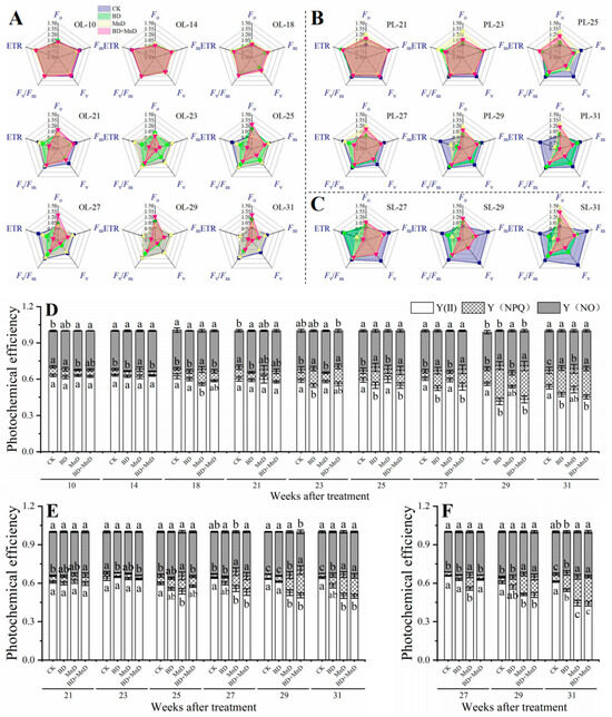 Compared with the CK group, the actual photochemical efficiency [Y(II)] values of OLs significantly decreased in weeks 23–31 under the BD treatment and in weeks 25–31 under the BD + MnD treatment; PLs displayed significantly reduced Y(II) values in weeks 25–31 of the MnD treatment and in weeks 27–31 of the BD + MnD treatment; and the Y(II) values of SLs dropped significantly in week 31 of the BD treatment, weeks 27–31 of the MnD treatment, and weeks 29–31 of the BD + MnD treatment. Interestingly, the Y(II) of PLs and SLs significantly decreased in the 29th and 31st weeks of the BD + MnD treatment, respectively. Compared with the CK group, the quantum yield of regulated energy dissipation [Y(NPQ)] values of OLs significantly declined in week 21 of the BD treatment and week 10 of the MnD treatment, whereas they significantly increased in weeks 23–31 of the BD and BD + MnD treatments and in weeks 14, 18, and 31 of the MnD treatment. In PLs, Y(NPQ) values significantly decreased in week 23 of the BD and BD + MnD treatments, while they significantly increased in week 31 of the BD treatment, weeks 25–31 of the MnD treatment, and weeks 21, 27, 29, and 31 of the BD + MnD treatment compared with the CK group. The Y(NPQ) values of SLs significantly increased in the 31st week under the BD treatment, in the 27th, 29th, and 31st weeks under the MnD treatment, and in the 29th and 31st weeks under the BD + MnD treatment compared with the CK group. The quantum yield of non-regulated energy dissipation [Y(NO)] values of OLs rose significantly in the 21st week of the BD treatment, the 10th and 29th weeks of the MnD treatment, and the 10th and 21st weeks of the BD + MnD treatment compared with the CK group. The Y(NO) values of PLs significantly declined in the 27th week of the MnD treatment and in the 29th week of the BD + MnD treatment compared with the CK (Figure 4D–F).