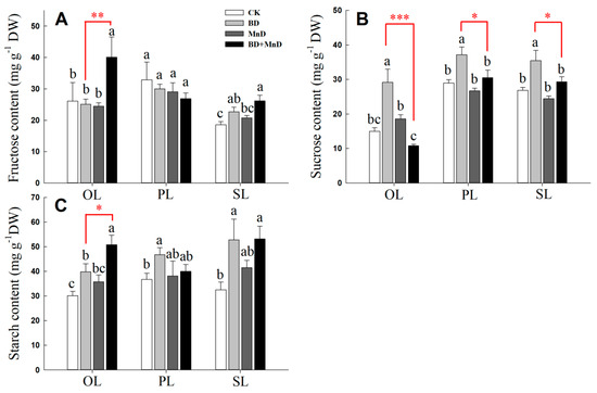The BD treatment group displayed significantly enhanced fructose content in ‘Newhall’ navel orange SLs, while the BD + MnD treatment significantly increased the fructose contents of OLs and SLs. In contrast, the fructose contents of other treatment groups and leaf types did not exhibit significant differences compared with the CK group. Apart from the finding that the fructose content of OLs was higher in the BD + MnD group than that in the BD group, the difference in fructose content between the BD and BD + MnD treatment groups was not significant. Compared with the CK, the BD treatment significantly promoted the sucrose contents of OLs, PLs, and SLs, while the MnD and BD + MnD treatments did not exhibit significantly increased sucrose contents, and the sucrose content of OLs was decreased under the BD + MnD treatment. Notably, the sucrose contents of OLs, PLs, and SLs were significantly higher in the BD treatment group compared to the BD + MnD treatment group. Except for PLs in the BD + MnD treatment group, OLs, PLs, and SLs contained significantly elevated starch contents in the BD and BD + MnD treatment groups compared with then CK group, but in the MnD treatment group the differences in starch content between leaf types were non-significant. In addition, OLs showed higher starch content in the BD + MnD treatment than in the BD treatment (Figure 5).