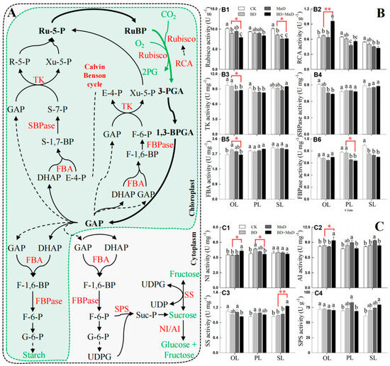 As shown in Figure 6, compared with the CK group, the BD treatment significantly reduced Rubisco activity in OLs, thymidine kinase (TK) activity in PLs, and Rubisco and fructose 1,6-bisphosphatase (FBPase) activity in SLs, whereas it significantly increased the activity of fructose 1,6-bisphosphate aldolase (FBA) in OLs. The MnD treatment significantly decreased the activity of TK in OLs; the activities of rubisco activase (RCA), TK, and FBPase in PLs; and the activities of Rubisco, RCA, TK, and FBPase in SLs. Under the BD + MnD treatment, the activity of RCA was significantly increased in OLs, while the activities of Rubisco, TK, and sedoheptulose 1,7-bisphosphatase (SBPase) were significantly decreased in OLs; Rubisco, RCA, TK, and FBPase displayed significantly reduced activities in PLs; and Rubisco, RCA, and FBPase showed significantly decreased activities in SLs. Interestingly, compared with the BD treatment, the BD + MnD treatment significantly increased RCA activity in OLs but significantly decreased the activities of Rubisco, TK, and FBA in OLs, that of FBPase in PLs, and that of Rubisco in SLs. Compared with the CK group, the BD treatment significantly promoted the activities of neutral invertase (NI) and synthetase (SS) in PLs; the MnD treatment significantly increased the activities of acid invertase (AI), SS, and sucrose phosphate synthase (SPS) in PLs and that of AI in SLs. The BD + MnD treatment significantly increased the activities of NI and AI in OLs and those of SS and SPS in SLs, whereas the SS activity in OLs was significantly decreased. Moreover, compared with the BD treatment, the BD + MnD treatment significantly suppressed NI activity in PLs but significantly enhanced NI and AI activities in OLs and SS activity in SLs.