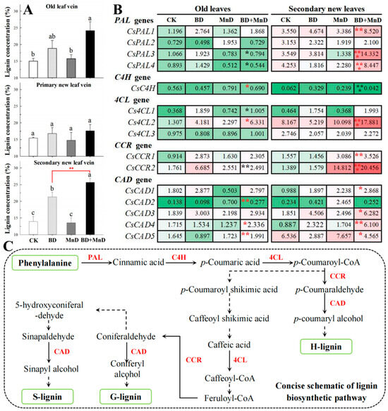 As shown in Figure 7A, compared with the CK group, the BD treatment significantly increased the lignin concentration in the veins of SLs; the BD + MnD treatment significantly enhanced the lignin concentration in the veins of OLs; and the MnD treatment had no significant effect on the lignin concentrations in the veins of all types of leaves. In addition, compared with the BD treatment, the BD + MnD treatment significantly promoted the lignin concentration in the veins of SL. The relative expression levels of key genes involved in lignin synthesis in OLs and SLs were analyzed. Compared with the CK group, in the BD treatment the CsPAL1, Cs4CL1, CsCCR1, CsCCR2, and CsCAD3 genes were significantly upregulated in OLs, while the CsCAD5 gene was significantly downregulated; CsPAL2, CsCCR1, and CsCAD2 were significantly upregulated in OLs in the MnD treatment; and CsPAL1, Cs4CL1, Cs4CL2, CsCCR1, CsCCR2, CsCAD1, CsCAD2, and CsCAD3 were significantly upregulated in OLs in the BD + MnD treatment. Compared with the BD treatment, in the BD + MnD treatment the expression levels of CsC4H, Cs4CL2, CsCAD2, CsCAD4, and CsCAD5 in OLs were significantly upregulated, while the expression levels of CsPAL3, CsPAL4, Cs4CL1, and CsCCR2 were downregulated. Compared with the CK group, in the BD treatment CsC4H, Cs4CL1, and CsCAD3 were significantly upregulated in SLs and CsCAD5 was significantly downregulated; in the MnD treatment, CsC4H, CsCCR1, CsCCR2, and CsCAD2 were significantly upregulated in SLs; and in the BD + MnD treatment, the expression levels of all other genes except for CsPAL2, CsC4H, Cs4CL3, CsCAD2, and CsCAD5 were significantly upregulated in SLs. Compared with the BD treatment, the BD + MnD treatment significantly promoted the expression levels of CsPAL1, CsPAL3, CsPAL4, Cs4CL2, CsCCR1, CsCCR2, CsCAD1, CsCAD3, CsCAD4, and CsCAD5 in SLs, while CsC4H was significantly downregulated (Figure 7B,C).