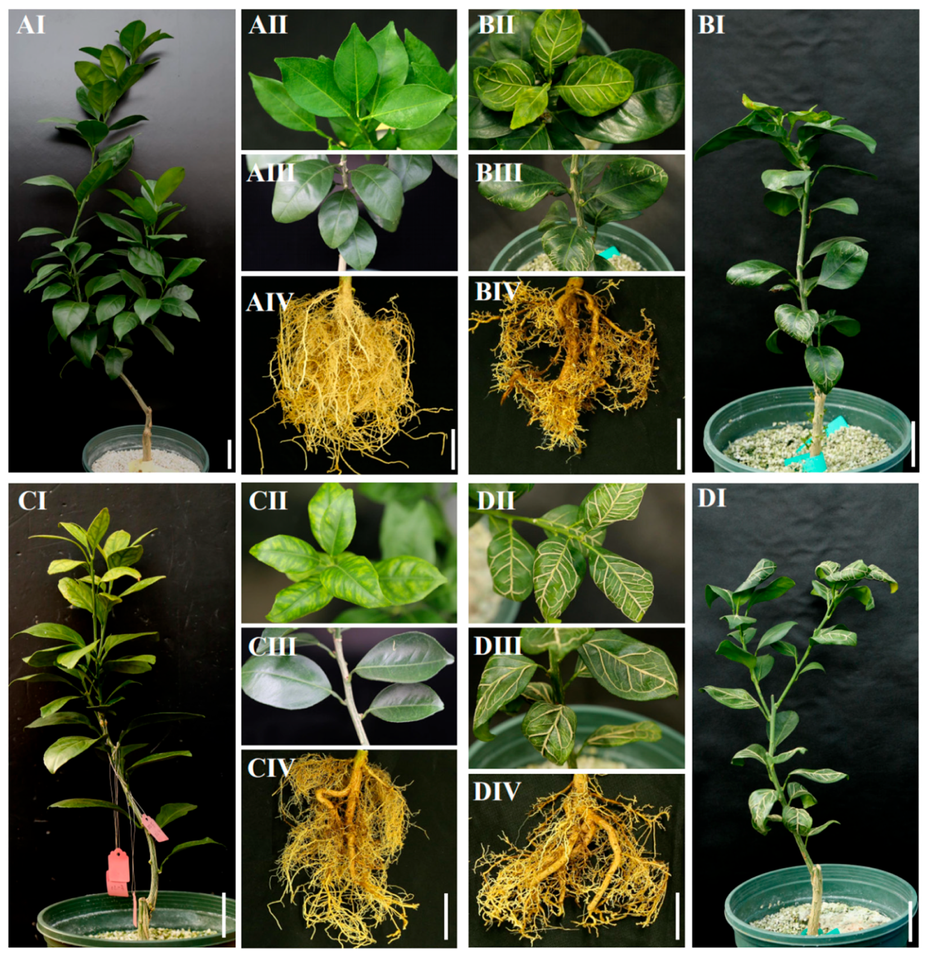 - Folimonova, S.Y.; Achor, D.S. Early events of citrus greening (Huanglongbing) disease development at the ultrastructural level. Phytopathology 2010, 100, 949–958. [Google Scholar] [CrossRef]