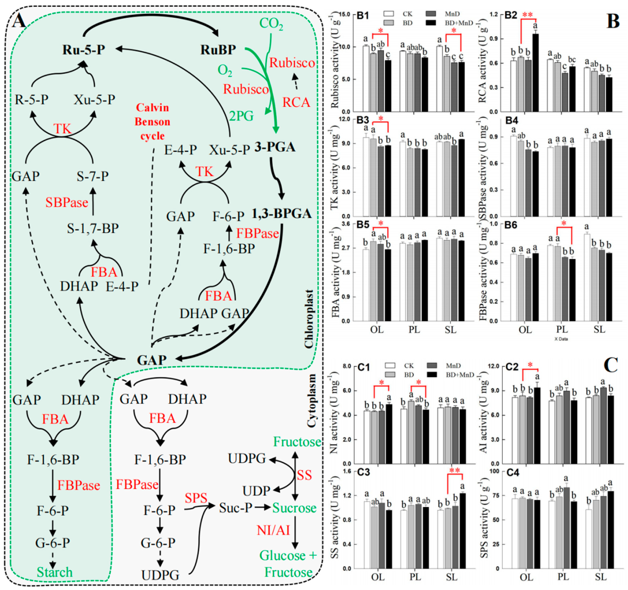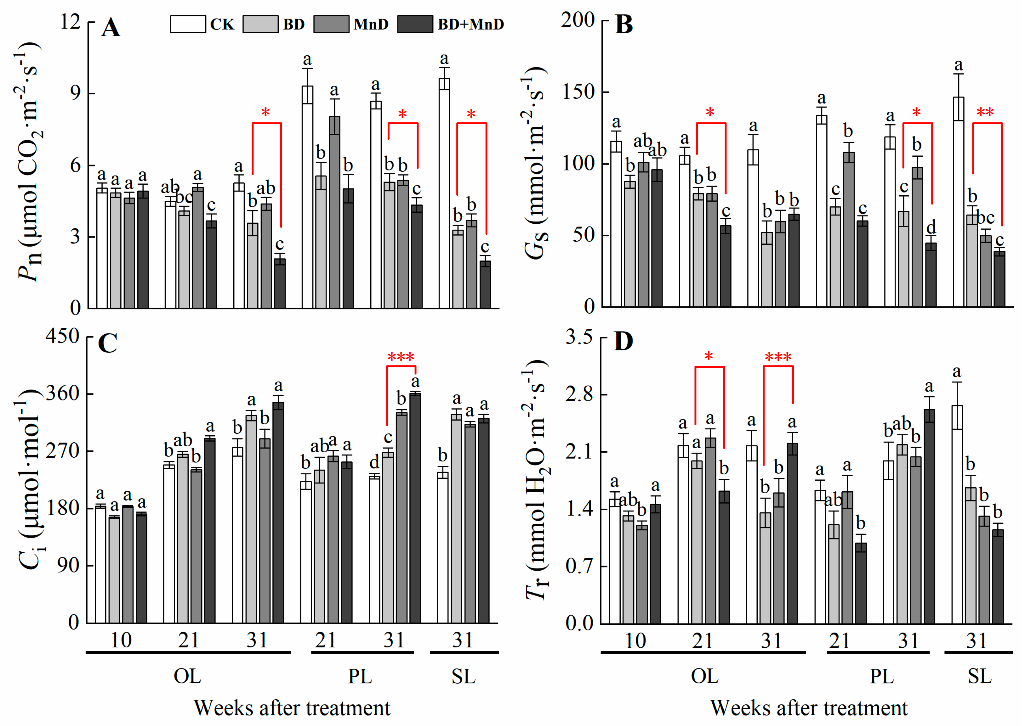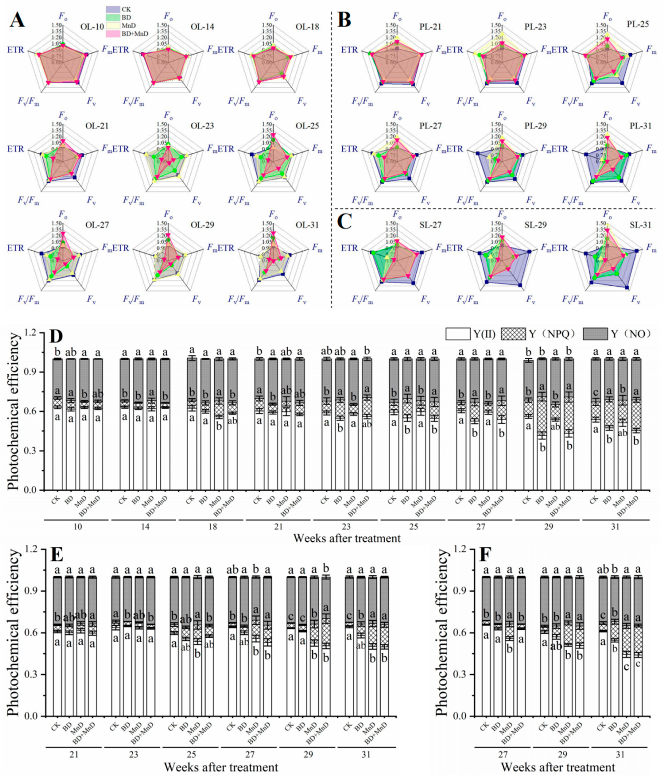 | Photosynthetic Pigment | CK | BD | MnD | BD + MnD | |
