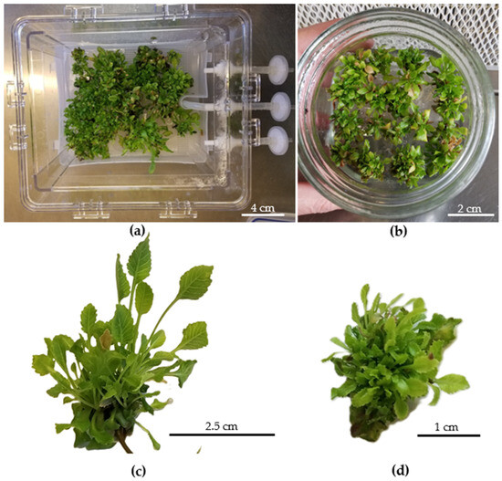 Shoot development of T. balsamita after 30 days. (a) Micropropagation of shoots in Plantform bioreactor. (b) Micropropagation of shoots in semisolid medium. (c,d) Shoot clusters grown in Plantform and semisolid medium.