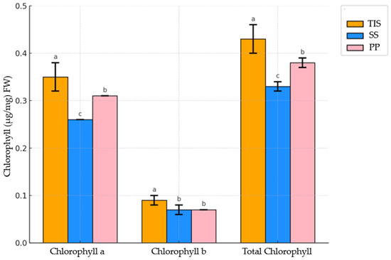 Total chlorophyll, which represents the combined functional capacity of the photosynthetic apparatus, showed a trend similar to that of chlorophyll a. Once again, the TIS recorded the maximum value (4.35 μg/mg FW), significantly higher than PP and SS (3.84 and 3.34 μg/mg FW, respectively). These data further support the hypothesis that the intermittent immersion provided by the TIS facilitated a microenvironment favorable to maximizing chlorophyll synthesis.