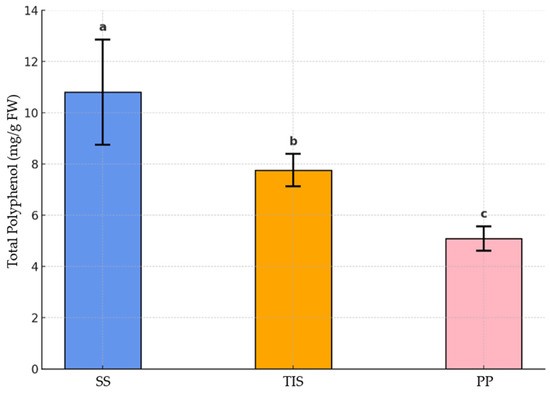The quantitative evaluation of total polyphenol content in T. balsamita under different culture conditions revealed statistically significant differences (Figure 4). The highest amount of polyphenols (10.87 mg/g FW) was observed in samples grown in the SS system, followed by those in the TIS (7.76 mg/g FW), while the PP samples exhibited the lowest value (5.09 mg/g FW). The results supported the assumption that the in vitro system, both SS and TIS, had the potential to enhance the accumulation of polyphenols, particularly in the SS culture, where the total polyphenols recorded were approximately 2-fold higher than those in the PP samples. On one hand, while the accumulation of secondary metabolites can be increased under stress conditions, the optimal growth conditions can activate the metabolic pathways that induce the production of compounds that are constitutively produced by the plant. SS conditions may be considered a method of culturing with a lower availability of nutrients fundamental for plant growth, resulting in reduced growth rate, and the metabolism may be addressed to the increment of the synthesis of secondary metabolites [65]. On the other hand, with the PP condition, nutrient availability may sustain plant growth at the expense of secondary metabolite accumulation. These assumptions were confirmed in the current study on T. balsamita, as these two culture conditions, SS and PP, induced the highest and lowest accumulation of polyphenolic compounds, respectively. Interestingly, the polyphenol content observed under TIS conditions was intermediate between that of the SS and PP extracts, highlighting the capacity of this culture system to effectively support both biomass production and the accumulation of secondary metabolites in the plant.