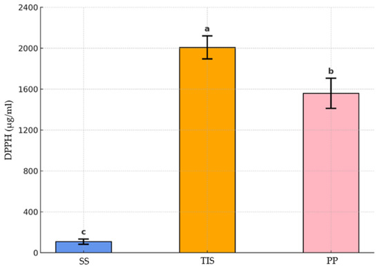 The antioxidant potential of T. balsamita was evaluated based on its DPPH radical scavenging capacity, showing statistically significant differences among the group samples (Figure 5).