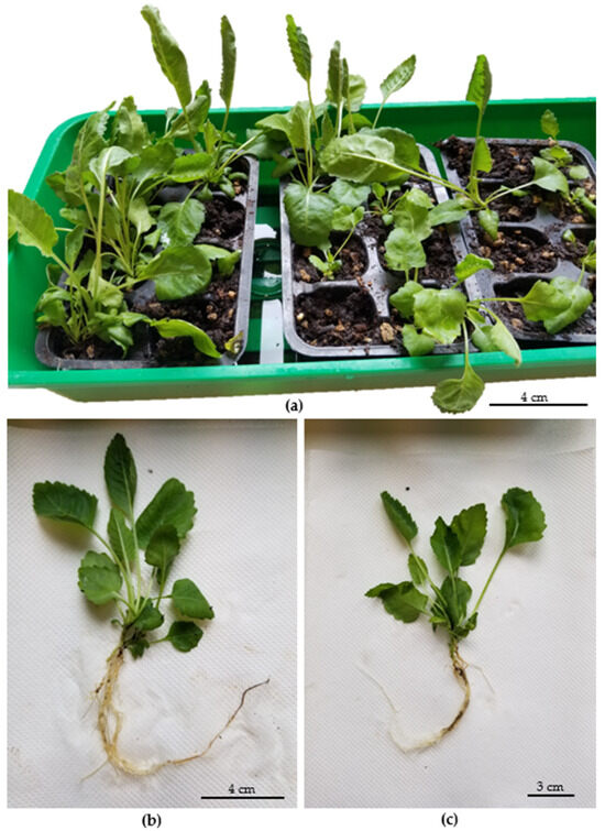 Acclimatization of T. balsamita plantlets after 45 days (a). Rooted plantlets derived from the Temporary Immersion System (TIS, Plantform bioreactor) (b) and semisolid medium (c).