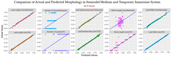 A comprehensive comparative analysis of the predictive performance of two machine learning models—Multilayer Perceptron (MLP) and Random Forest (RF)—regarding the estimation of five key morphological parameters of plantlets cultivated under semisolid and TIS conditions is presented in Table 5. The evaluation of these models was conducted utilizing four standard regression metrics: the coefficient of determination (R2), root mean square error (RMSE), mean absolute error (MAE), and concordance correlation coefficient (CCC). This approach offers a thorough perspective on accuracy, precision, and agreement between observed and predicted values.