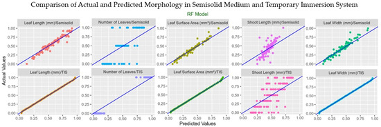 Overall, these findings showed that the MLP model provided better predictive ability for most morphological traits and culture systems, especially for traits affected by leaf structure. Although RF is typically less accurate, it performed well in predicting leaf number in TIS conditions. The differences in model performance across traits and culture systems highlighted the need to select models based on specific contexts in plant morphometric analysis, supporting the use of deep learning methods like MLP for precise phenotyping in plant tissue culture.
