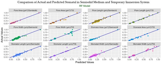 Actual and predicted values of stomatal traits: pore area, pore width, pore length, stomatal area, stomatal length, and stomatal width in T. Balsamita plantlets grown in the Temporary Immersion System (TIS) and semisolid medium (SS), as predicted by the Random Forest (RF) model.
