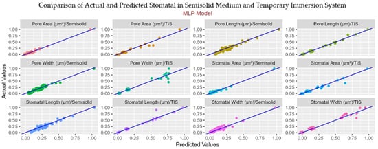 The scatter plots illustrate the relationship between actual and predicted stomatal trait values for the RF and MLP models (Figure 9 and Figure 10, respectively). The integration of ML techniques into plant tissue culture research has demonstrated substantial potential for accurately modeling complex, nonlinear relationships between culture parameters and plant responses. In our study, which compared the predictive performance of MLP and RF models across two distinct culture systems, SS and TIS, for both morphological and stomatal traits, model–trait–system interactions were observed that are consistent with, yet also distinct from, trends reported in the literature.
