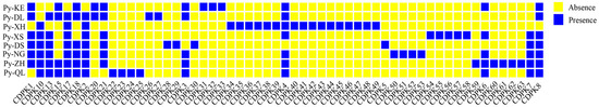 Analysis of the presence and absence of CDPKs in pear genotypes. Py-KE: Kuerle Xiangli; Py-DL: an individual of P. betulifolia; Py-XH: Xuehua; Py-XS: Shinseiki; Py-DS: Dangshan Suli; Py-NG: Nanguoli; Py-ZH: Zhongai 1; Py-QL: Clapp’s Favorite; yellow indicates gene absence; blue indicates gene presence.