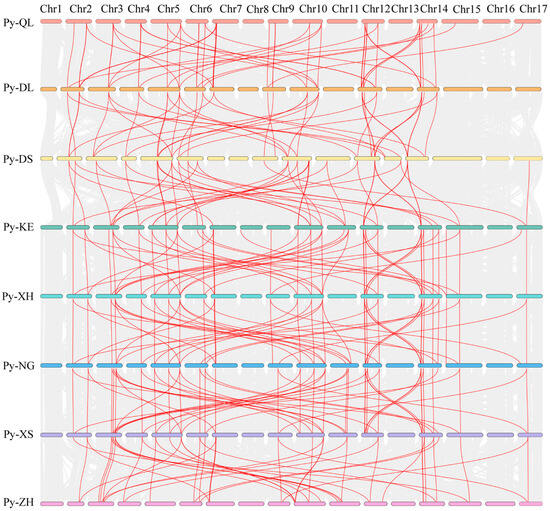 Collinearity analysis of PyCDPKs in pear genotypes. Py-QL: Clapp’s Favorite; Py-DL: an individual of P. betulifolia; Py-DS: Dangshan Suli; Py-KE: Kuerle Xiangli; Py-XH: Xuehua; Py-NG: Nanguoli; Py-XS: Shinseiki; Py-ZH: Zhongai 1; Chr1-17 represents the 17 chromosomes.