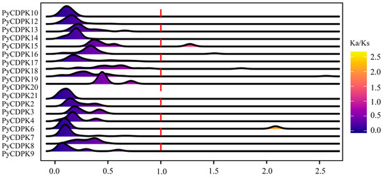 The protein and coding sequence (CDS) sequences of the CDPK genes in the eight pear genomes were obtained from the Pear Genome Database (http://pyrusgdb.sdau.edu.cn (accessed on 8 May 2025)). PyCDPK sequences were compared and Ka/Ks values were calculated using the KaKs Calculator [33]. The R packages ggridges and ggplot2 v4.0.3 were used to create the Ridgeline plot of the Ka/Ks value [34,35].