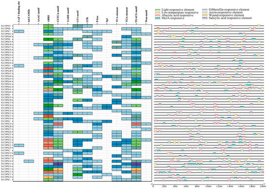 Cis-acting element analysis of PyCDPKs in pear genotypes. The colors and numbers in the graphic represent the count of cis-acting elements present in each gene.