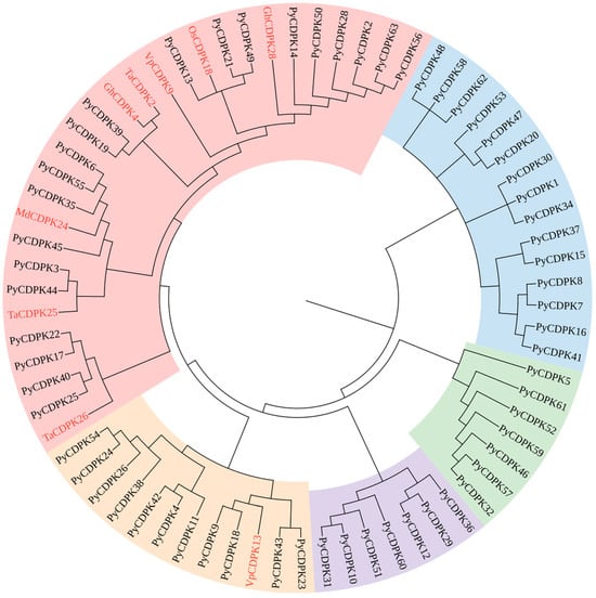 Phylogenetic analysis of PyCDPKs in pear genotypes and disease-related CDPKs from other plant species. It contains 63 identified PyCDPKs and previously reported disease-resistance CDPK homologs from other species, with those highlighted in red representing rice (OsCDPK18), wheat (TaCDPK2, TaCDPK25, TaCDPK26), grape (VpCDPK9, VpCDPK13), apple (MdCDPK24), and cotton (GhCDPK4). The different-colored arcs represent distinct phylogenetic subfamilies.