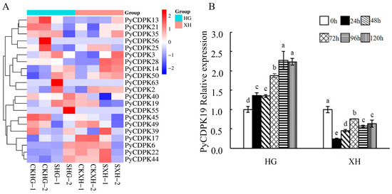 Response of PyCDPKs to V. nashicola. (A): Expression levels of subfamily I PyCDPKs after V. nashicola inoculation. (B): Relative expression of PyCDPK19. CKHG: mock-inoculated ‘Huangguan’ pear (resistant); CKXH: mock-inoculated ‘Xuehua’ pear (susceptible); SHG: V. nashicola-inoculated ‘Huangguan’ pear; SXH: V. nashicola-inoculated ‘Xuehua’ pear. Each treatment included two biological replicates. Leaf tissues were collected at 0, 24, 48, 72, 96, and 120 h post-inoculation (hpi). Each treatment included three biological replicates. Different lowercase letters indicate statistically significant differences among groups (p < 0.05).