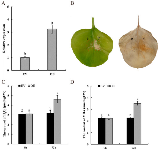 Transient expression of PyCDPK19 in tobacco. (A): Relative expression of PyCDPK19 in tobacco leaves overexpressed for 72 h. (B): Transient overexpression of PyCDPK19 induces a hypersensitive response, displayed as a phenotype, and DAB staining at 72 h. e: pEGOEP35S-H; f: pEGOEP35S-H-PyCDPK19. (C): Determination of H2O2 content after transient overexpression of PyCDPK19 in tobacco leaves for 72 h. (D): Determination of MDA content after transient overexpression of PyCDPK19 in tobacco leaves for 72 h. EV: pEGOEP35S-H treatment; OE: pEGOEP35S-H-PyCDPK19 treatment. Different lowercase letters indicate significant differences (p < 0.05).