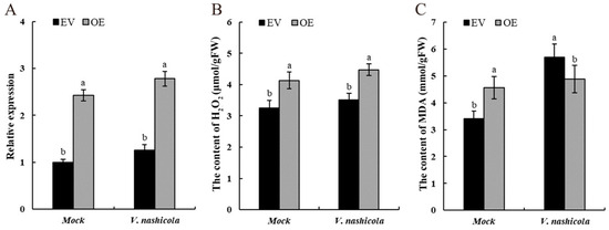 Transient PyCDPK19 expression in pear calli. (A): Relative expression of PyCDPK19 in pEGOEP35S-H and pEGOEP35S-H-PyCDPK19 calli after V. nashicola infection. (B): Determination of H2O2 content in calli transiently overexpressing PyCDPK19 after inoculation with V. nashicola. (C): Determination of MDA content in calli transiently overexpressing PyCDPK19 after inoculation with V. nashicola. Different lowercase letters show significant differences (p < 0.05). EV: pEGOEP35S-H treatment; OE: pE-GOEP35S-H-PyCDPK19 treatment.