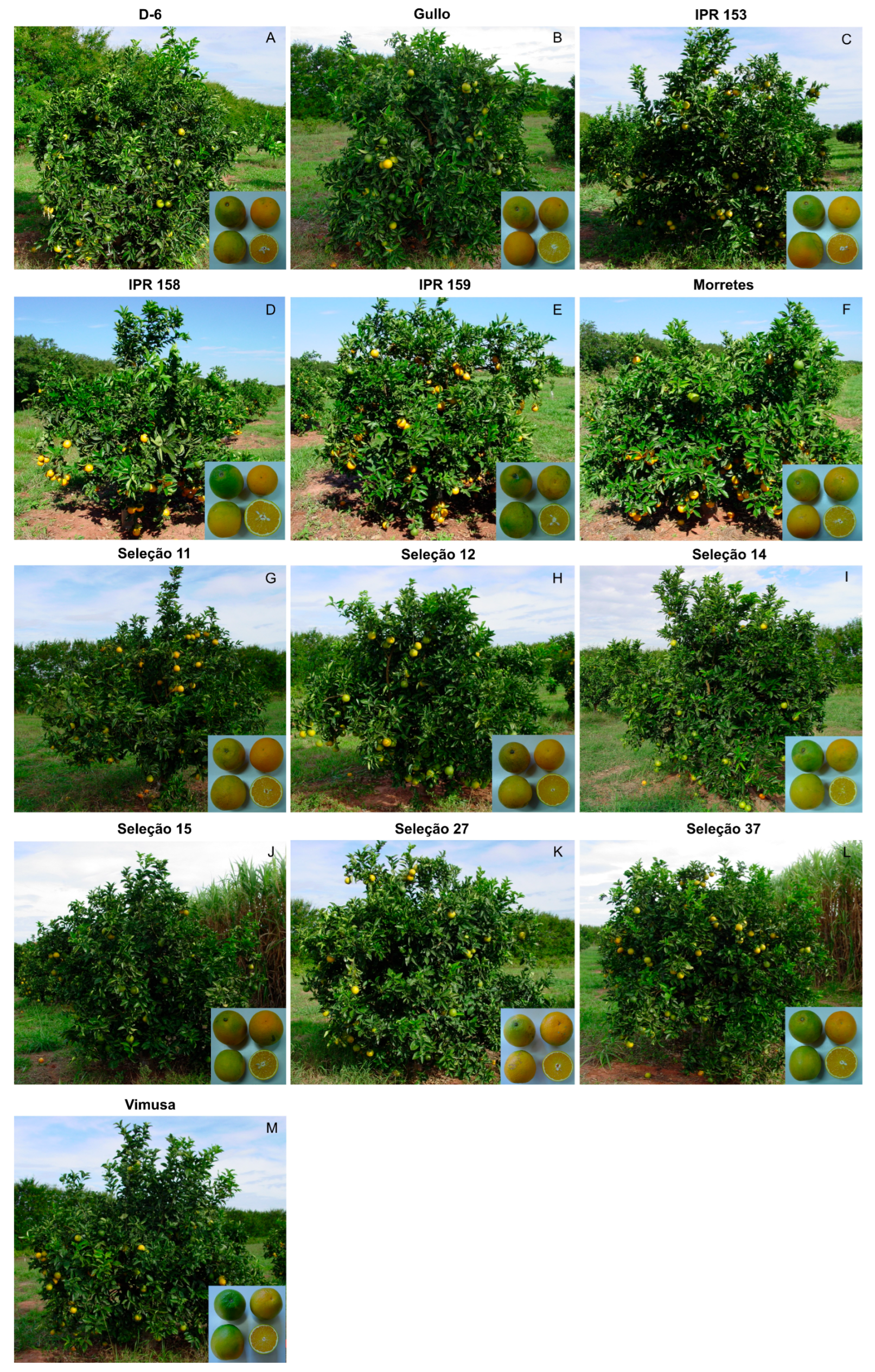 - Pio, R.M.; Figueiredo, J.O.D.; Stucchi, E.S.; de Cardoso, S.A.B. Variedades Copas. In Citros; de Mattos Junior, D., De Negri, J.D., Pio, R.M., Pompeu Junior, J., Eds.; Instituto Agronômico e Fundag: São Paulo, Brazil, 2005; Volume 1, pp. 39–62. [Google Scholar]