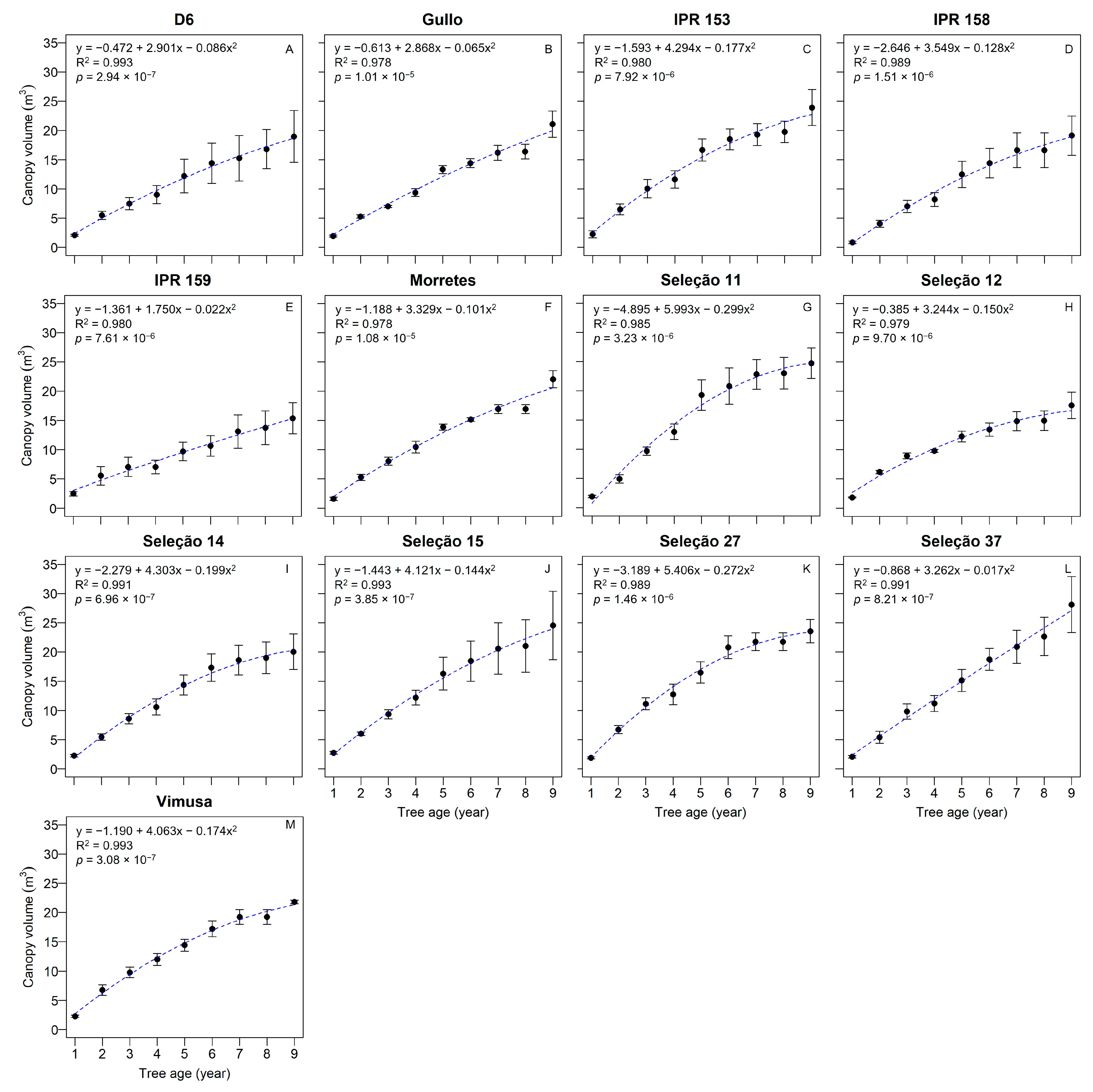 Pera Selection | Rootstock Trunk Diameter (cm) a | Scion Trunk Diameter (cm) | Trunk Diameter Index b | Tree Height (m) | Canopy Diameter (m) | Canopy Volume (m3) |