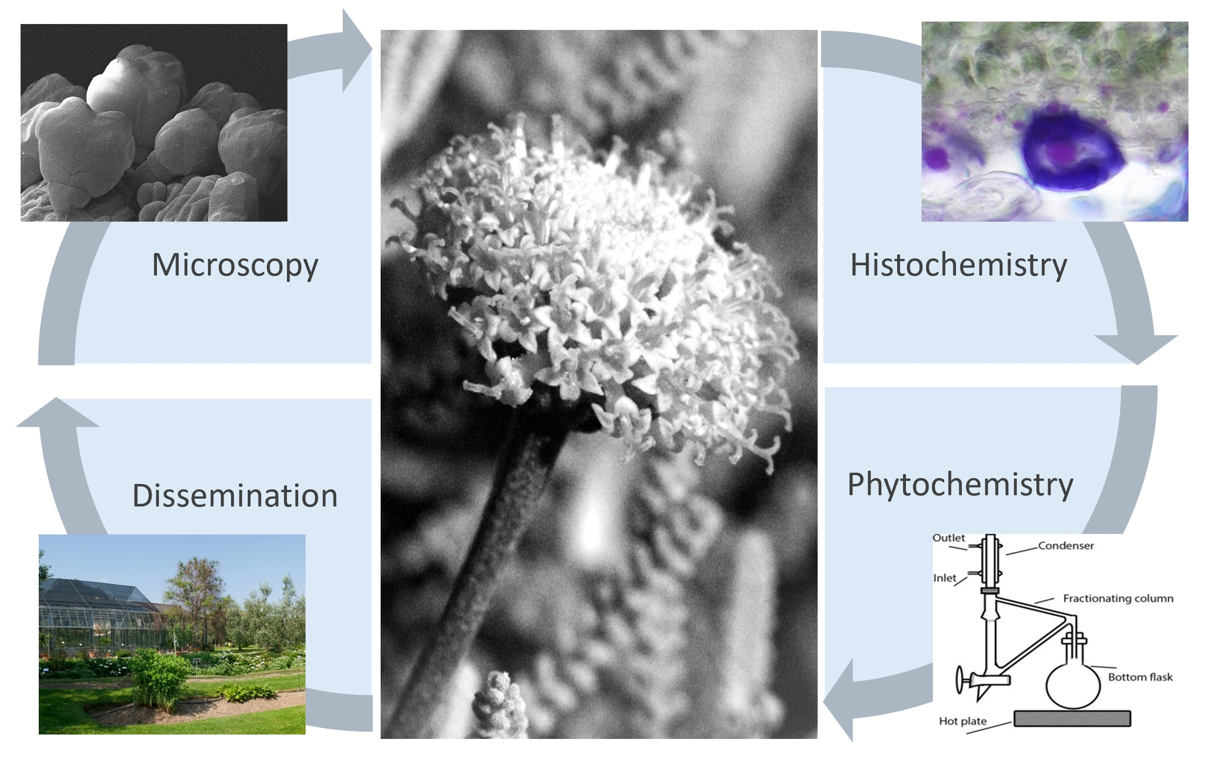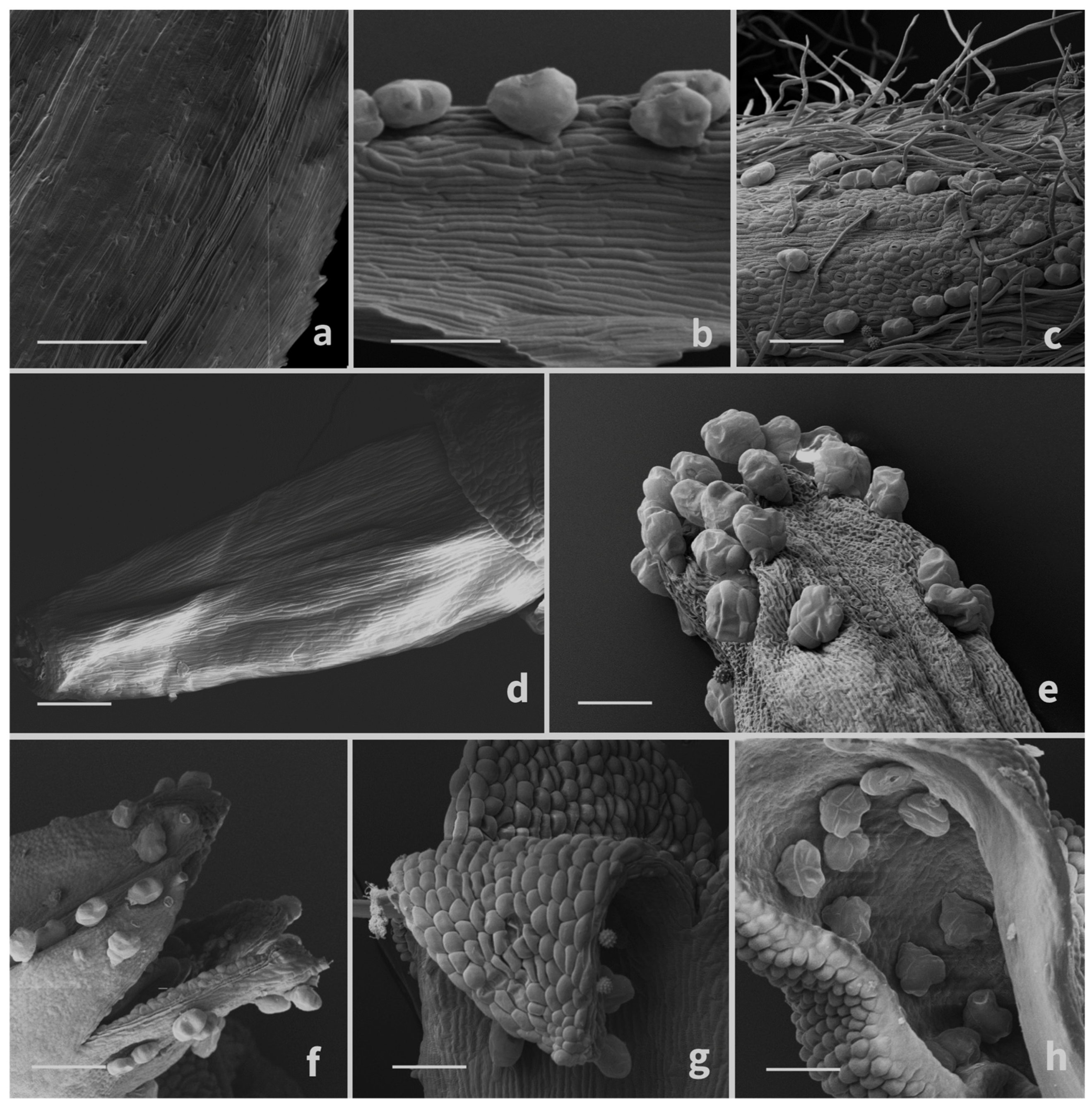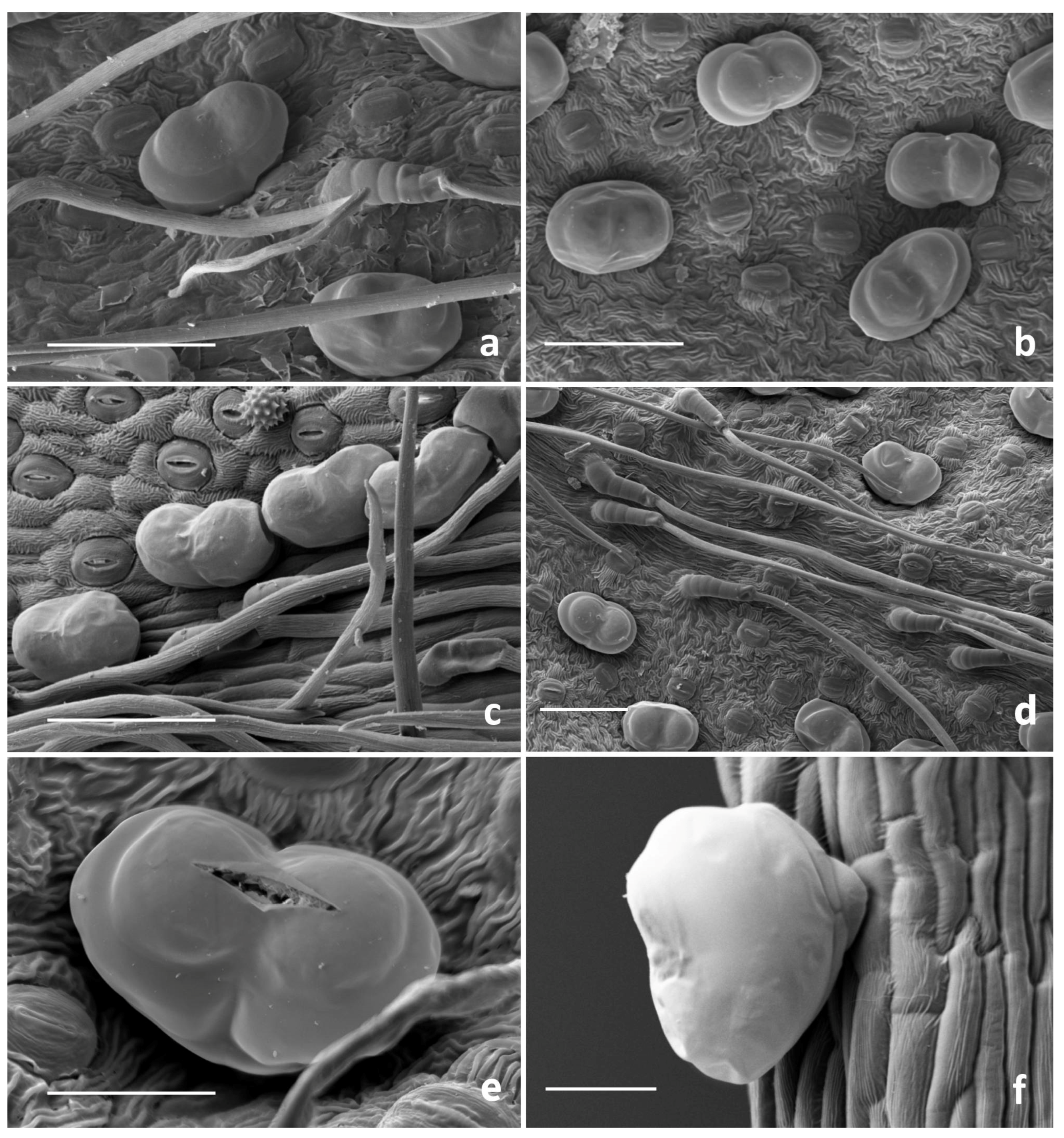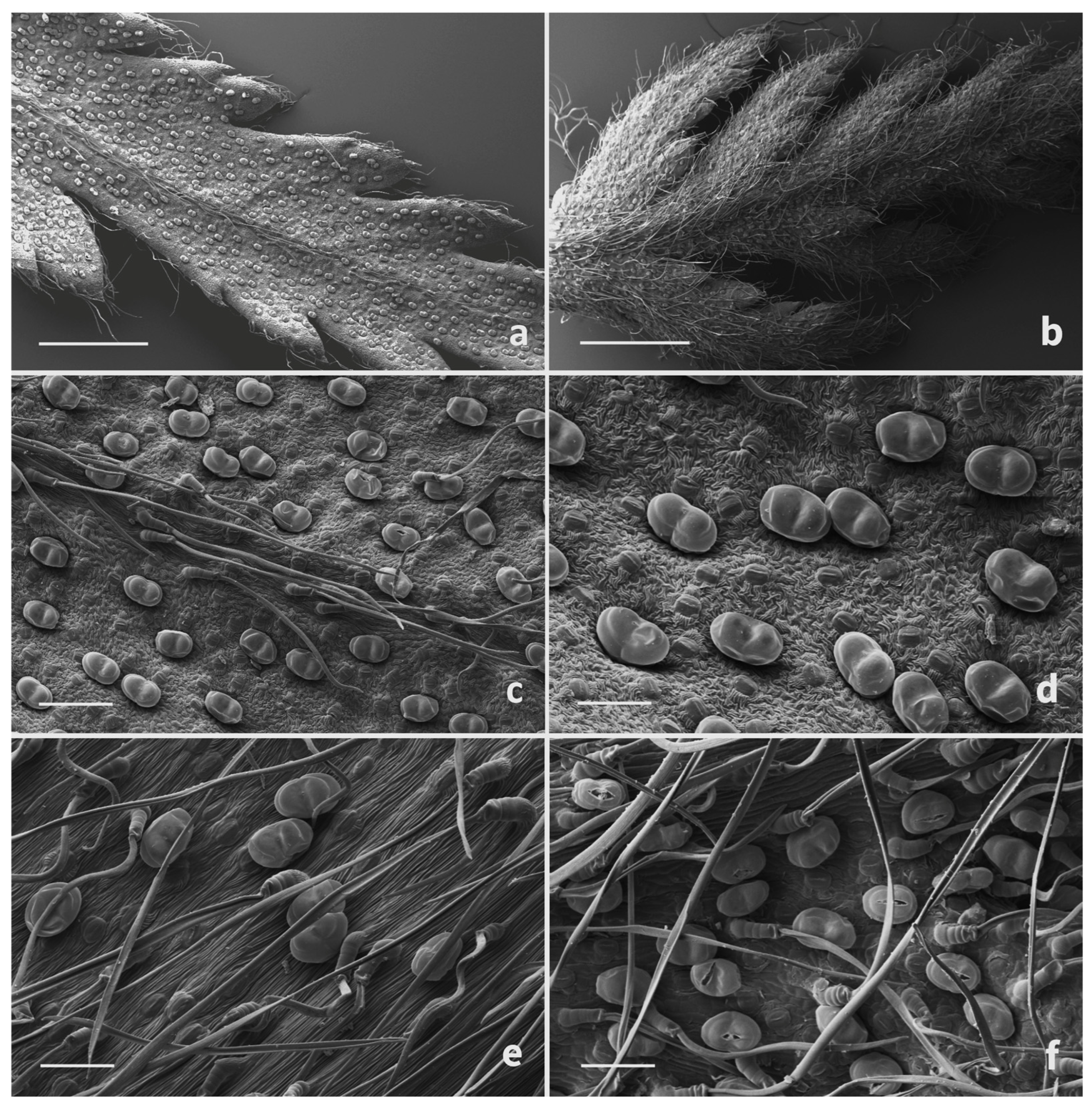 - The micromorphological approach, combining digital light and fluorescence microscopy with scanning electron microscopy, allowed us to describe for the first time the non-glandular indumentum and the glandular structures of both the vegetative and reproductive organs; specifically, our survey demonstrated a great affinity regarding the micromorphology and the distribution pattern of the secretory structures between the target species and the congeneric taxa known in literature, whereas the histochemistry proved to be divergent, with the homogeneous production of oleoresin and polyphenols in both the glandular hairs and the internal ducts.