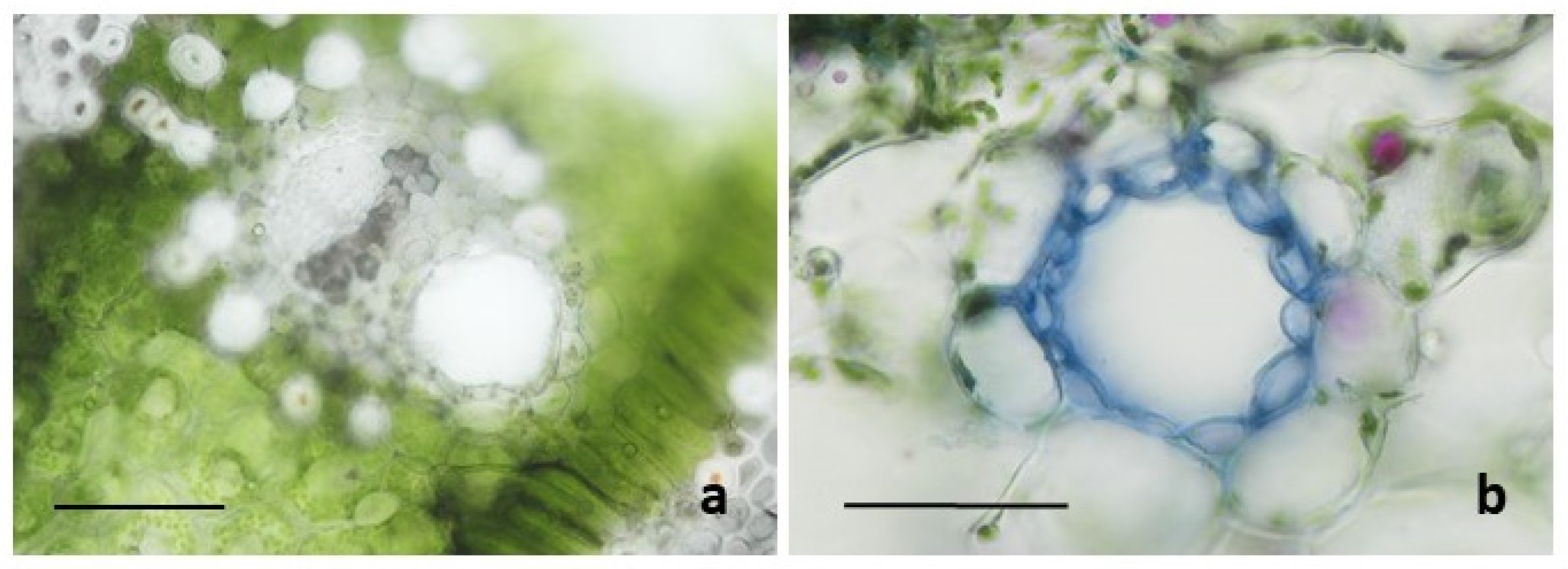 - Martínez-Quezada, D.M.; Rojas-Leal, A.; Villaseñor, J.L.; Terrazas, T. Structural considerations and differences between leaf canals and secretory cavities in Asteraceae. Protoplasma 2025, 262, 707–720. [Google Scholar] [CrossRef]